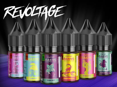 Eine weitere Linie innerhalb der Revoltage Hybrid Nikotinsalze ist die OASYS-Serie. Auch diese Liquids werden gebrauchsfertig in 10 ml Flaschen und mit den Nikotinstärken 0 mg/ml, 10 mg/ml sowie 20 mg/ml angeboten. Die OASYS-Serie erweitert das Geschmacksspektrum um zusätzliche Kompositionen. Dazu gehören Sorten wie Nubian Mountain (Heidelbeer-Trauben Mix, exotische Noten), Lemon Ice (Zitrone mit eisiger Frische), Black Nana (rote Traube, Minze, Kühle), Gum Ice (süßer Kaugummi, eisige Frische), Grape Mint (orientalische Minze, Traube, Kühle) und Double Apple (Apfel, Anis).