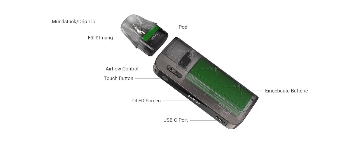 Bei der iCita von Eleaf handelt es sich um eine E-Zigarette aus dem Bereich der offenen Pod-Systeme mit einer Kapazität von 1.600 mAh und regelbarer Leistung zwischen 6 und 40 Watt. Beim Set trifft der gleichnamige Akku, welcher im Variable Wattage-Modus betrieben wird, auf den iCita Pod mit einem Tankvolumen von 3 Millilitern und integrierter Wicklung. Zum Lieferumfang des Kits gehören ein iCita Pod, welcher mit 0,3 Ohm das subohme Dampfen mit direkter Lungeninhalation unterstützt sowie eine 0,6 Ohm Cartridge, welche das moderate Vapen im MTL-Bereich ebenso ermöglicht wie restriktivere Züge direkt in die Lunge. Die Eleaf iCita wird über einen integrierten Touchscreen gesteuert. Dank eines OLED-Displays sind Sie über betriebliche Parameter wie die momentane Ausgangsleistung, die Anzahl der getätigten Züge und den aktuellen Ladestand des internen Akkus informiert. Über das zum Lieferumfang Ihres Sets gehörende USB-Type C-Kabel kann dieser beschleunigt und optimiert mit frischer Energie versorgt werden. Die iCita Pods werden durch Zusammenstecken mit dem Housing des Akkus verbunden. Lederapplikationen verleihen dem Mod beim Dampfen einen sicheren Halt in der Hand.