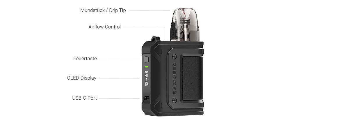 Die GeekVape Aegis HQ ist eine kompakte E-Zigarette aus der Kategorie der offenen Pod Mods. Beim Set trifft der gleichnamige Akku mit einer Kapazität von 1.300 mAh und bis zu 30 Watt Ausgangsleistung auf die GeekVape Q Cartridge mit 3 Millilitern Tankvolumen. Zum Lieferumfang des Sets gehören zwei passende Cartridges mit integrierten Coils: Während die Q Cartridge mit 0,8 Ohm für das moderate Dampfen vom Mund zur Lunge ausgelegt ist, ermöglicht der 0,6 Ohm Q Pod restriktive Züge direkt in die Lunge. Die Aegis HQ arbeitet im Variable Wattage-Modus mit geregelter Ausgangsleistung. Gesteuert wird das Gerät über die Feuertaste, die Aktivierung kann optional auf Zug am Mundstück oder klassisch über die Feuertaste erfolgen. Betriebliche Parameter und vorgenommene Einstellungen behalten Sie dank des integrierten 0,54” OLED-Displays stets übersichtlich im Blick. Der interne Akku kann mit bis zu 2 Ampere Ladestrom über das mitgelieferte USB-Type C-Kabel effizient mit frischer Energie versorgt werden. Devices der Aegis-Serie von GeekVape sind besonders robust, so ist auch die Aegis HQ durch ein spezielles Coating bei Stürzen und Stößen gesichert. Die kompatiblen Q Pods werden durch einfaches Zusammenstecken mit dem Housing des Akkus verbunden.