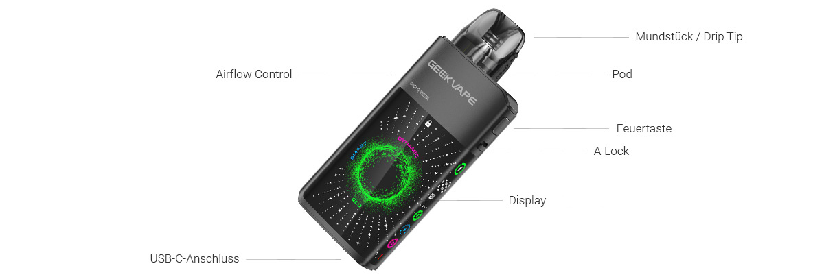Das GEEKVAPE Digi Q Vista E-Zigaretten Set bietet eine maximale Ausgangsleistung von 35 Watt und lässt sich in den Modi ECO, SMART und DYNAMIC betreiben. Ein Display zeigt Informationen wie Watt-Einstellungen, Batteriestand und Betriebsmodus an. Eine verstellbare Airflow ermöglicht den Wechsel zwischen MTL (Mund zu Lunge) und RDL (Restricted Direct To Lung). Der GEEKVAPE Digi Q Vista Akku verfügt über eine Kapazität von 1.600 mAh. Die Energieversorgung des internen Akkus erfolgt über das zum Lieferumfang gehörende USB-C-Kabel.