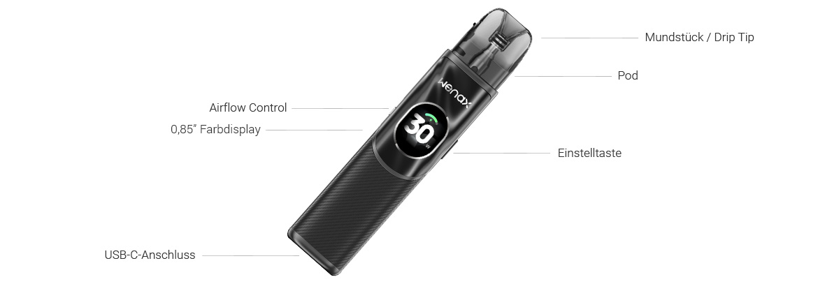 Die Bedienung der Wenax Q2 ist dank des klaren 0,85” Farbdisplays denkbar einfach. Hier haben Sie alle wichtigen Informationen auf einen Blick: Neben der aktuellen Leistung wird Ihnen der Akkustand übersichtlich in drei Farben angezeigt. Grün steht für mehr als 60% Ladung, Blau signalisiert 21% bis 59% und Rot weist darauf hin, dass die Akkukapazität unter 20% liegt und ein Aufladen bald nötig ist. Das Aufladen selbst erfolgt unkompliziert über den modernen USB-C Anschluss an der Unterseite des Geräts. Ein passendes USB-C Kabel ist bereits im Lieferumfang enthalten, sodass Sie sofort startklar sind. Die GeekVape Wenax Q2 ist somit eine durchdachte und benutzerfreundliche E-Zigarette, die Leistung, Anpassungsfähigkeit und Komfort in einem eleganten Paket vereint.