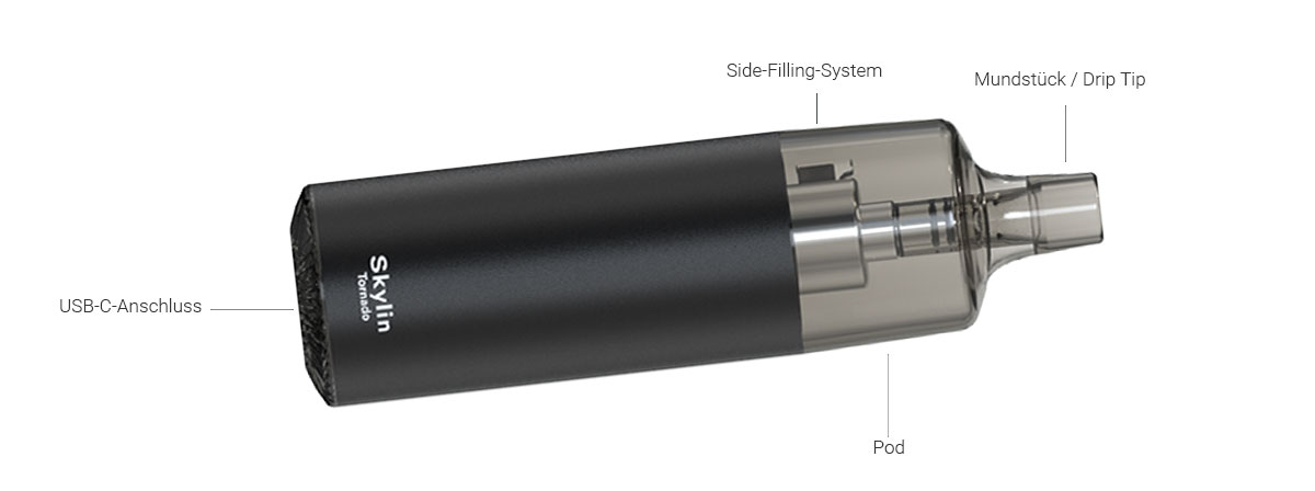 Beim Tornado Skylin E-Zigaretten-Set von GOBAR trifft der gleichnamige Akku mit einer Kapazität von 1.000 mAh auf die Tornado Skylin Cartridge, welche sich durch ein großzügiges Tankvolumen von 10 Millilitern auszeichnet. Integraler Bestandteil des Pods ist eine Mesh Coil mit einem Widerstand von 0,8 Ohm. Aufgrund des Widerstandes der Wicklung ist die GOBAR Tornado Skylin für das moderate Dampfen vom Mund zur Lunge optimiert. Die E-Zigarette wird intuitiv auf Zug am Mundstück aktiviert. Da das Device ohne Tasten oder andere Bedienelemente auskommt und keine weiterführenden Einstellungen erfordert, ist es auch für weniger erfahrene Nutzer gut geeignet. Ein RGB LED-Indikator an der Unterseite des Geräts informiert Sie in unterschiedlichen Farben über den Ladestand des internen Akkus. Über das zum Lieferumfang des Sets gehörende Type C-USB-Kabel kann dieser mit bis zu einem Ampere Ladestrom beschleunigt und optimiert mit frischer Energie versorgt werden. Neben drei monochromen Farbvarianten ist das Device auch in zwei Designoptionen mit einer augenfälligen Musterung erhältlich. Die Verbindung einer Cartridge mit dem Housing des Akkus wird bei der Tornado Skylin E-Zigarette durch einfaches Zusammenstecken hergestellt.