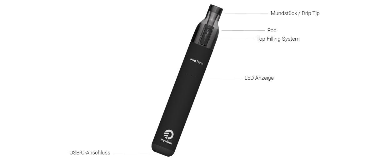 Der im Set enthaltene eGo Nano Pod bietet ein Tankvolumen von 2,0 ml für Ihr Liquid. Das Befüllen erfolgt über ein Top-Filling-System, bei dem eine Silikonkappe am oberen Teil des Pods aufgeklappt wird, um die Einfüllöffnung freizulegen. Dies ermöglicht das Nachfüllen, ohne den Pod vom Akku trennen zu müssen. Der Verdampferkopf mit einem Widerstand von 0,8 Ohm ist fest im Pod verbaut, weshalb der gesamte Pod als Verbrauchseinheit bei nachlassender Dampf- oder Geschmacksentwicklung ausgetauscht wird. Mit seinen Abmessungen von 17,5 mm im Durchmesser und 113,4 mm in der Höhe ist das eGo Nano Set als schlankes und portables Gerät konzipiert.
