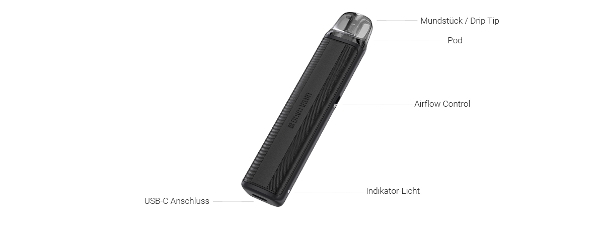 Der Ursa V3 Pod hat ein Tankvolumen von 2,5 Millilitern und ein Top Filling-System zur Befüllung von oben. Die Cartridge ist transparent gestaltet. Über einen Schieberegler an der Seite kann der Zugwiderstand der Airflow Control stufenlos eingestellt werden. Der zum Set gehörende Ursa V3 Pod verfügt über eine integrierte 0,6 Ohm Coil. Zum Lieferumfang gehört auch ein Lanyard. Pods mit integrierten Wicklungen sind Verschleißteile und müssen bei nachlassender Dampfmenge oder Geschmacksveränderungen des Liquids ersetzt werden.