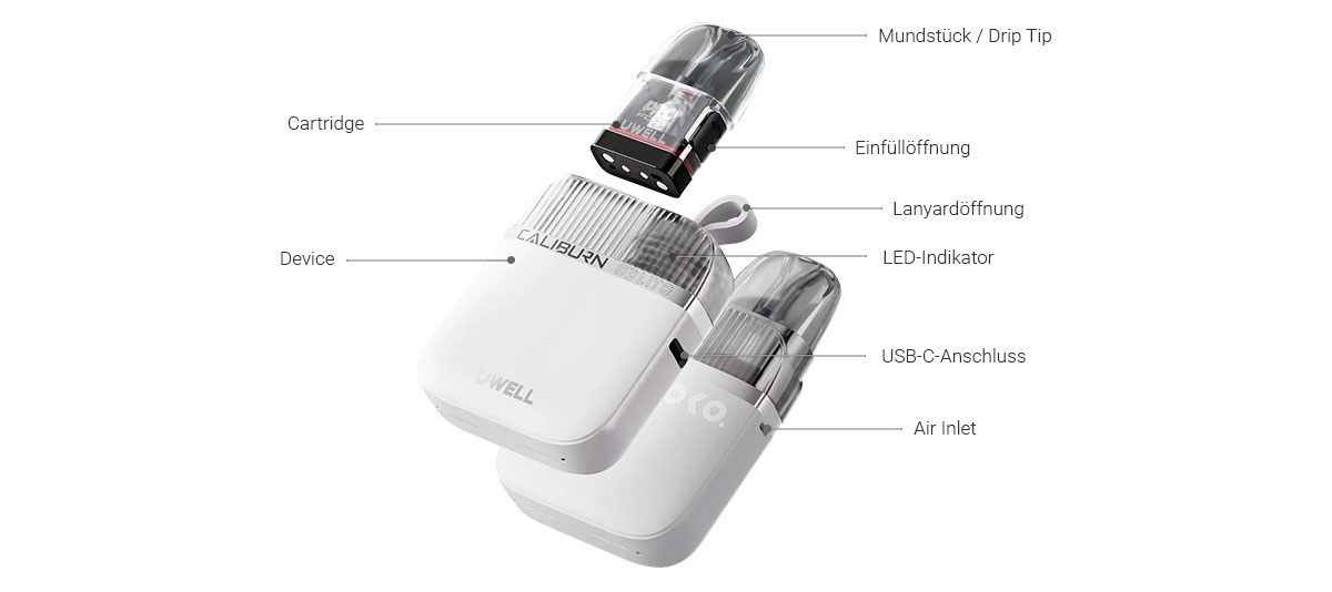 Die UWELL Caliburn G3 Lite Koko ist eine E-Zigarette aus dem Bereich der offenen Pod-Systeme. Beim Set trifft der gleichnamige Mod mit einer Kapazität von 1.200 mAh und bis zu 25 Watt Ausgangsleistung auf den Caliburn G3 Pod mit einem Tankvolumen von 2,5 Millilitern. Der Pod kommt mit einer integrierten Coil, welche mit einem Widerstand von 0,6 Ohm für das Vapen mit restriktiven Zügen direkt in die Lunge ausgelegt ist, gleichzeitig aber auch das moderate Dampfen mit Zügen vom Mund zur Lunge erlaubt. Das Gerät wird intuitiv auf Zug am Mundstück aktiviert. Die E-Zigarette hat keine Tasten und erfordert keine weiteren Einstellungen, so dass sie auch für weniger erfahrene Nutzer geeignet ist. Ein links des Mundstücks platzierter LED-Indikator informiert Sie über den Ladestand des integrierten Akkus. Mit bis zu 2 Ampere Ladestrom kann dieser über den Type C-USB-Port beschleunigt und optimiert mit frischer Energie versorgt werden. Bitte beachten Sie, dass ein entsprechendes USB-Type C-Ladekabel nicht Bestandteil des Lieferumfangs ist. Als optionaler Zubehörartikel kann es bei Bedarf hier in unserem Shop erworben werden. Die Caliburn G3 Cartridge wird durch schlichtes Zusammenstecken mit dem Housing des Akkus verbunden.