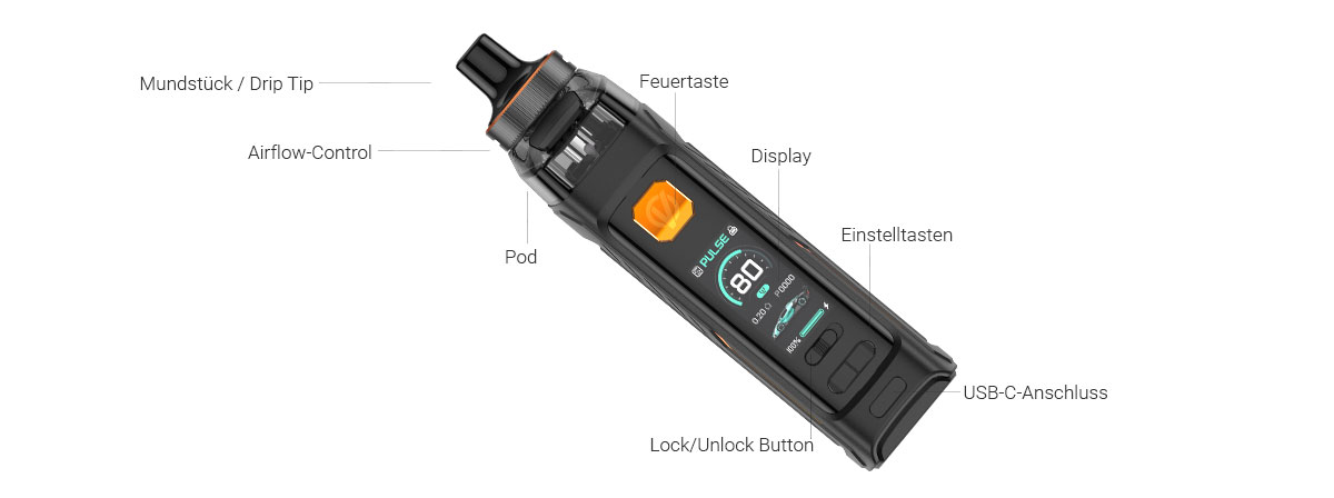 Bestandteil des ARMOUR G E-Zigaretten-Sets von Vaporesso ist der gleichnamige Akku mit einer Kapazität von 3.000 mAh sowie einer Ausgangsleistung von bis zu 80 Watt und der ARMOUR G Pod mit einem Tankvolumen von 5 Millilitern und integriertem Top Filling-System. Zum Lieferumfang gehören darüber hinaus zwei kompatible Verdampferköpfe, die mit unterschiedlichen Widerständen verschiedene Zugtechniken unterstützen. Während der vorinstallierte GTX Mesh Head mit einem Widerstand von 0,6 Ohm das moderate Dampfen vom Mund zur Lunge ermöglicht, unterstützt der ebenfalls mitgelieferte Verdampferkopf mit 0,4 Ohm das subohme Vapen mit direkter Lungeninhalation. Im Variable Wattage-Modus (VW) arbeitet die Vaporesso ARMOUR G mit regelbarer Leistung. Gesteuert wird die E-Zigarette über die Feuertaste in Kombination mit zwei Einstelltasten. Ein Schieberegler oberhalb der Einstelltasten ermöglicht ein zügiges Sperren des Devices zum Schutz vor unbeabsichtigter Aktivierung. Betriebliche Parameter wie die aktuelle Ausgangsleistung oder den Ladestand des internen Akkus behalten Sie dank des 0,96” TFT-Farbdisplays stets übersichtlich im Blick. Mit bis zu 2 Ampere Ladestrom kann das Gerät über das mitgelieferte Type C-USB-Kabel effizient mit frischer Energie versorgt werden. Die Verbindung der Cartridge mit dem Housing des Akkus wird durch einfaches Zusammenstecken hergestellt.
