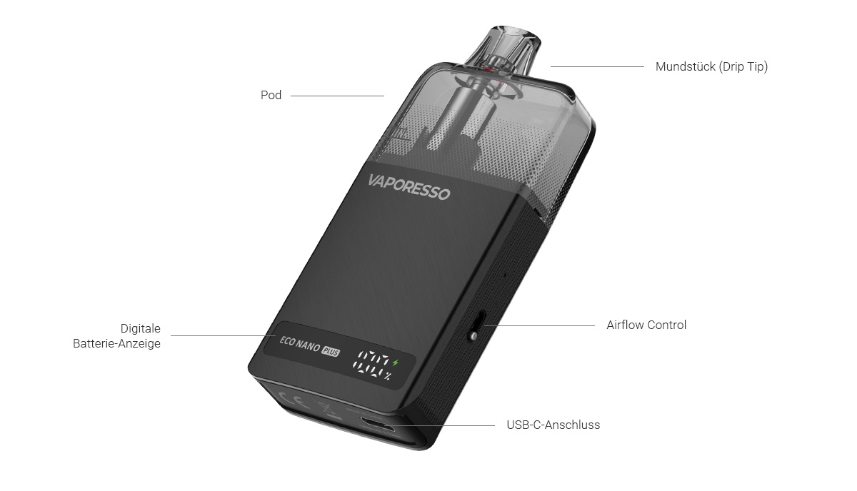 Der Akku des Vaporesso ECO Nano Plus Pod-Systems verfügt über eine fest integrierte Akkuzelle mit einer Kapazität von 1.400 mAh und die Maße 99,1 mm x 45,6 mm x 18 mm. Er operiert mit einer automatischen Leistungsanpassung an den Widerstand der eingesetzten Cartridge. Die Bedienung erfolgt ohne Tasten über die integrierte Zugautomatik. Zur Anpassung des Zugverhaltens ist eine regulierbare Airflow Control an der Seite vorhanden. Das Gerät verfügt über eine digitale Akkuanzeige, die den Ladestand anzeigt. Geladen wird das Gerät über einen USB-C Anschluss, der einen Ladevorgang mit bis zu DC 5V / 2A unterstützt. Es gilt zu beachten, dass ein USB-C Ladekabel nicht Teil des Lieferumfangs ist.
