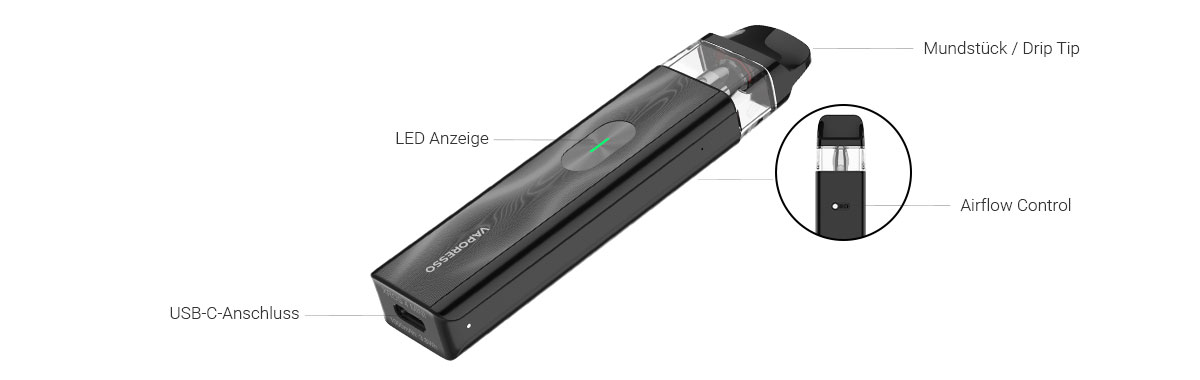 Das XROS 4 Mini E-Zigaretten-Set von Vaporesso besteht aus dem gleichnamigen Akku mit einer Kapazität von 1.000 mAh und einem passenden XROS Mesh Pod mit einem Tankvolumen von 3 Millilitern. Die in die Cartridge integrierte Mesh Coil zeichnet sich durch einen Widerstand von 0,8 Ohm aus, wodurch das Gerät für das Vapen mit restriktiveren Zügen direkt in die Lunge geeignet ist. Ein integrierter LED-Indikator gibt Aufschluss über den Ladestand des internen Akkus. Leuchtet der Indikator grün, so liegt dieser zwischen 100 und 70%, eine Restladespannung von 70 bis 30% wird durch blaues Leuchten abgebildet und sobald die Ladespannung unter 30% sinkt, leuchtet der Indikator rot. Über das zum Lieferumfang gehörende Type-C USB-Kabel kann der Akku mit bis zu einem Ampere Ladestrom effizient mit frischer Energie versorgt werden. Die regelbare Airflow Control der XROS 4 Mini erlaubt es, den Zugwiderstand entsprechend individueller Bedürfnisse anzupassen. Über einen Schieberegler an der Außenseite des Mods kann sie stufenlos gesteuert werden. Die Verbindung der Cartridge mit dem Housing des Akkus erfolgt durch einfaches Zusammenstecken.