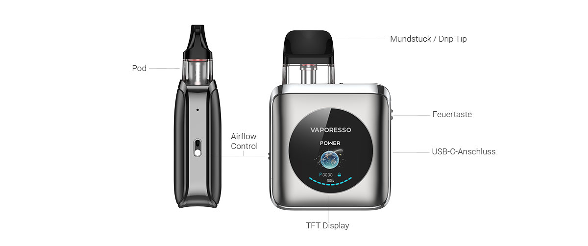 Der interne Akku mit einer Kapazität von 1.350 mAh kann mit bis zu 2 Ampere Ladestrom über das mitgelieferte Type C-USB-Kabel mit frischer Energie versorgt werden. Für den Betrieb der XROS 4 Nano von Vaporesso stehen Ihnen drei verschiedene Betriebsoptionen zur Verfügung. Drücken Sie die Feuertaste drei Mal in schneller Folge, um zwischen den verfügbaren Modi zu wechseln. Im Power-Modus können Sie die Ausgangsleistung individuell anpassen. Der ECO-Mode gewährleistet einen besonders energieeffizienten Betrieb. Durch zweimaliges Betätigen der Feuertaste gelangen Sie in ein Menü, wo Sie unter anderem aus verschiedenen Themen für die Darstellung auf dem Bildschirm wählen können. Viermaliges Drücken der Feuertaste sperrt bzw. entsperrt das Gerät, durch fünfmaliges Drücken wird das Device an- bzw. ausgeschaltet. Die regelbare Airflow Control der XROS 4 Nano ermöglicht es Ihnen, den Zugwiderstand der E-Zigarette Ihren persönlichen Vorstellungen entsprechend anzupassen. Über einen Schieberegler an der Seite des Mods kann sie stufenlos gesteuert werden. Je weiter der Lufteinlass geschlossen wird, desto restriktiver fällt der Zugwiderstand aus.